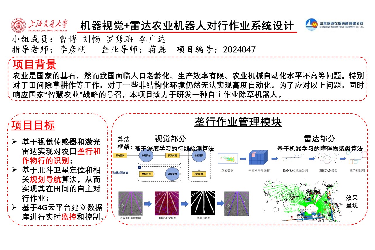 1、技术实现与应用: 项目成功开发并整合了基于深度学习的行线检测算法和基于机器学习的障碍物聚类算法,提升了机器人在田间作业的智能化水平。