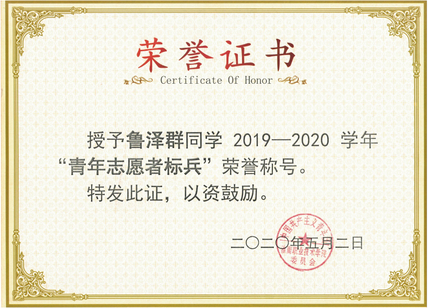 鲁泽群,男, 1994年8月生,中共党员,安徽芜湖人,beat365英国官方网站18级计算机应用技术专业学生,现任18计算机应用技术2班班长。2020年“安徽省十佳大学生”推荐人选(学风创优)。