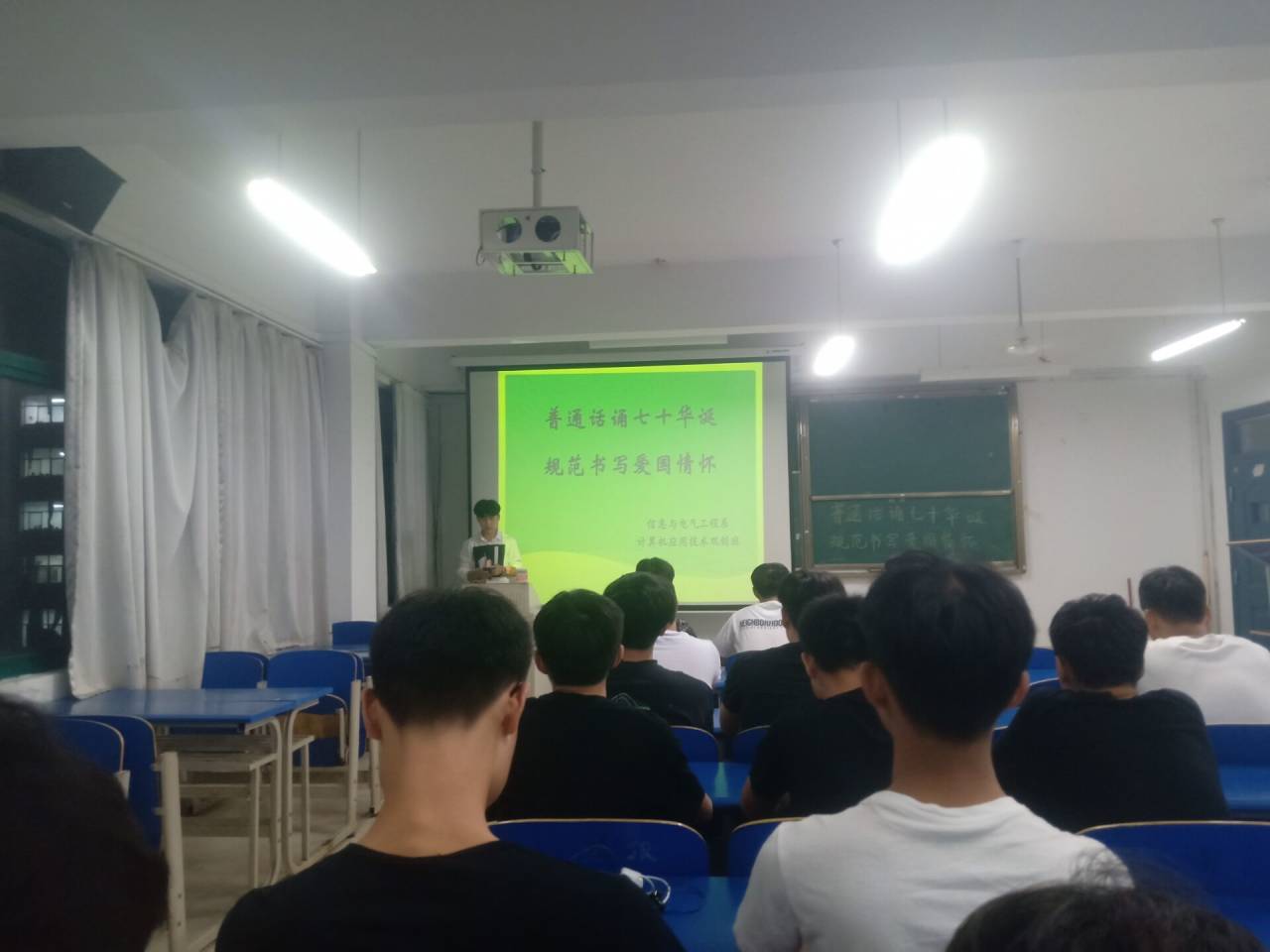 为了大力推广和规范使用国家通用语言文字,弘扬社会主义核心价值观和中华优秀传统文化,信电系近日开展了“普通话诵七十华诞,规范字书爱国情怀”系列主题活动。9月17日,信电系19级新生利用晚自习时间,以班级为单位开展了普通话诵读比赛,同学们积极性很高,比赛现场气氛热烈。【撰稿:蒋军摄影:刘瑞 审核:刘国华】