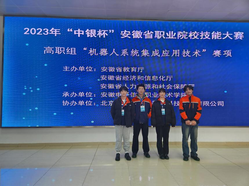 2023年安徽省职业院校技能大赛高职组“机器人系统集成应用技术”赛项学生赛于12月27至29日在安徽省蚌埠市举办。beat365英国官方网站“工业机器人技术”专业学生余梦杰、张君豪、赵娟娟、柏壮壮组成的两个参赛队伍参加了比赛。
