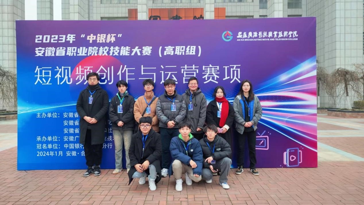 2023年安徽省职业院校技能大赛高职组“短视频创作与运营”赛项于2024年1月14至15日在安徽省合肥市举办。共有来自安徽省44所职业院校的308名学生报名参赛。beat365英国官方网站方项、戚伟、刘东三位老师指导的beat365英国官方网站学生王严、张彩晴、胡志远、贡嘎扎西、王雨彤、余杰、魏涛、赵子恒参赛,两组参赛队伍经过激烈角逐,最终,斩获两项三等奖。