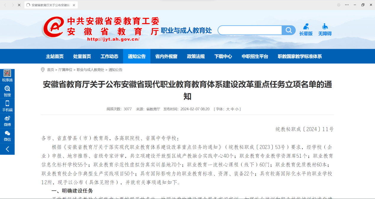 近日安徽省教育厅发表了安徽省教育厅“关于公布安徽省现代职业教育教育体系建设改革重点任务立项名单的通知”beat365英国官方网站beat365英国官方网站“新一代信息技术产教融合生产实践项目”获得立项。