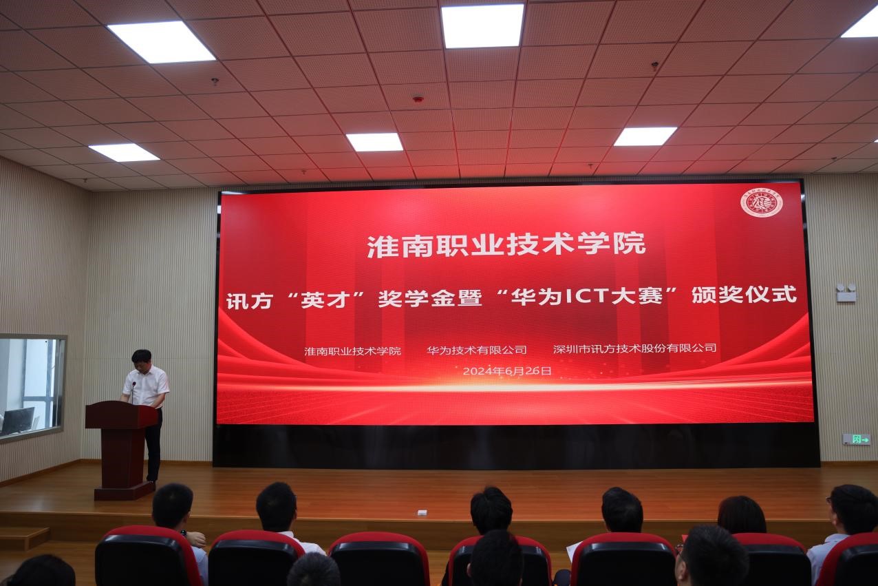 参观结束后,阜阳科技职业学院的代表受邀共同参加了讯方“英才”奖学金、华为 ICT 大赛颁奖典礼。典礼上,袁爱清指出,学校一直致力于为学生提供全面、优质的教育资源,不仅注重学术知识的传授,更重视培养学生的创新思维和实践能力,正是秉持这样的育才理念,学校才得以培养出了一批批优秀的人才。随后,beat365英国官方网站副院长曹祺、华为云生态发展与运营部部长戚光裕以及讯方技术华中片区总经理易君等发表讲话,表达了他们对beat365英国官方网站的美好祝愿,并期待在未来能够取得更进一步的合作,此次颁奖典礼还邀请了学校和企业领导为获奖学生颁发荣誉证书,表彰在学业、实践及品德方面全面发展的优秀学生,以激励他们不断追求卓越。