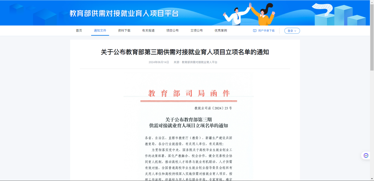 近日教育部发表了“关于公布教育部第三期供需对接就业育人项目立项名单的通知”,beat365英国官方网站beat365英国官方网站申报的“供需对接就业实习基地项目”成功获批立项。此次立项标志着学院在深化产教融合、校企合作方面取得了新的突破,为提升学生实践能力和促进高质量就业奠定了坚实基础。