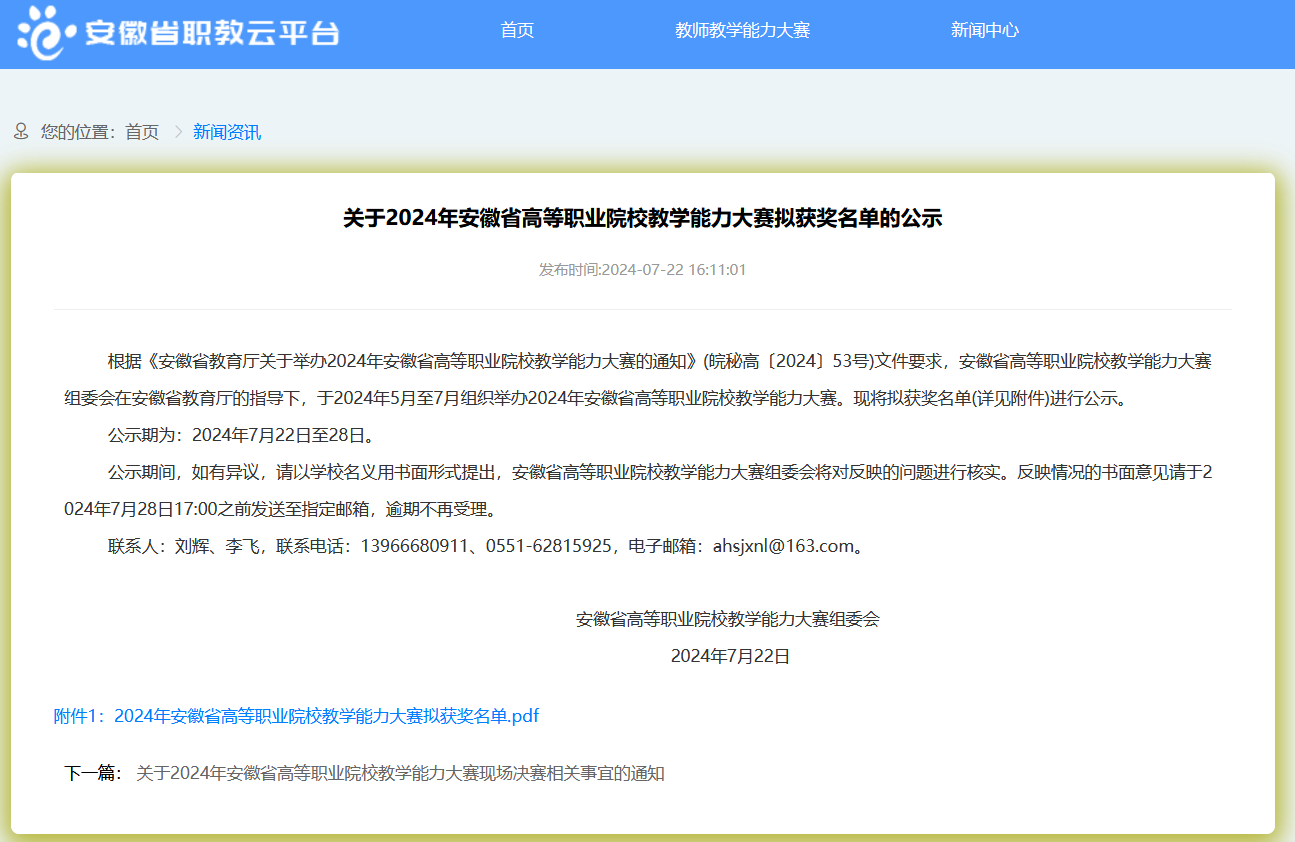 近日,安徽省高等职业院校教学能力大赛比赛圆满落幕,beat365英国官方网站高度重视此次比赛,精心组织,积极备赛,经过激烈角逐,beat365官网戚伟、桑冬青、陈猛、孙成兵团队以及刘杨斌、曹祺、马艳梅、刘东团队凭借出色的教学设计、精湛的教学技艺和默契的团队协作,分别荣获了高职专业课程一组和二组三等奖。这是学院在教学能力比赛中取得的最好成绩,充分展示了学院教师在教学领域的卓越能力和专业素养,不仅为学院赢得了荣誉,更为学院的教育教学改革和师资队伍建设注入了新的动力。