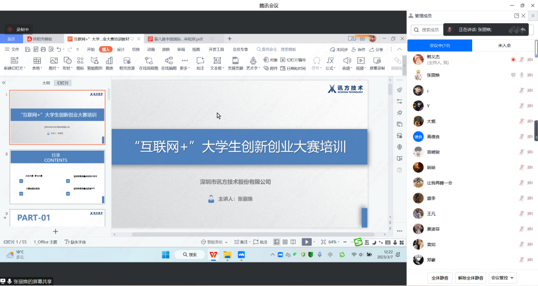 2023年3月7日12:00-13:45,beat365英国官方网站在线上举行“互联网+”大学生创新创业大赛培训讲座。主讲教师为深圳市讯方技术股份有限公司教学管理部副总监张丽焕老师,参加线上培训的为beat365英国官方网站的参赛学生。