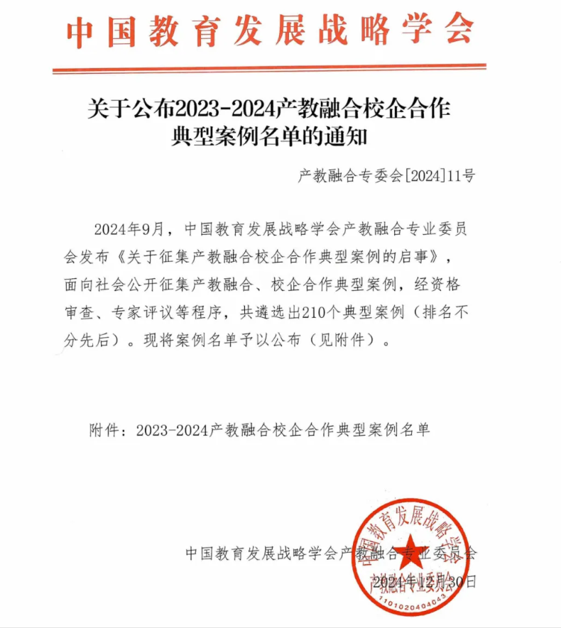 近日,中国教育发展战略学会公布了《2023-2024产教融合校企合作典型案例名单的通知》(产教融合专委会[2024]11号),beat365英国官方网站申报的《多层次、四融通、岗位供需链接:产教融合培养新一代信息技术人才创新与实践典型案例》案例成功入选。