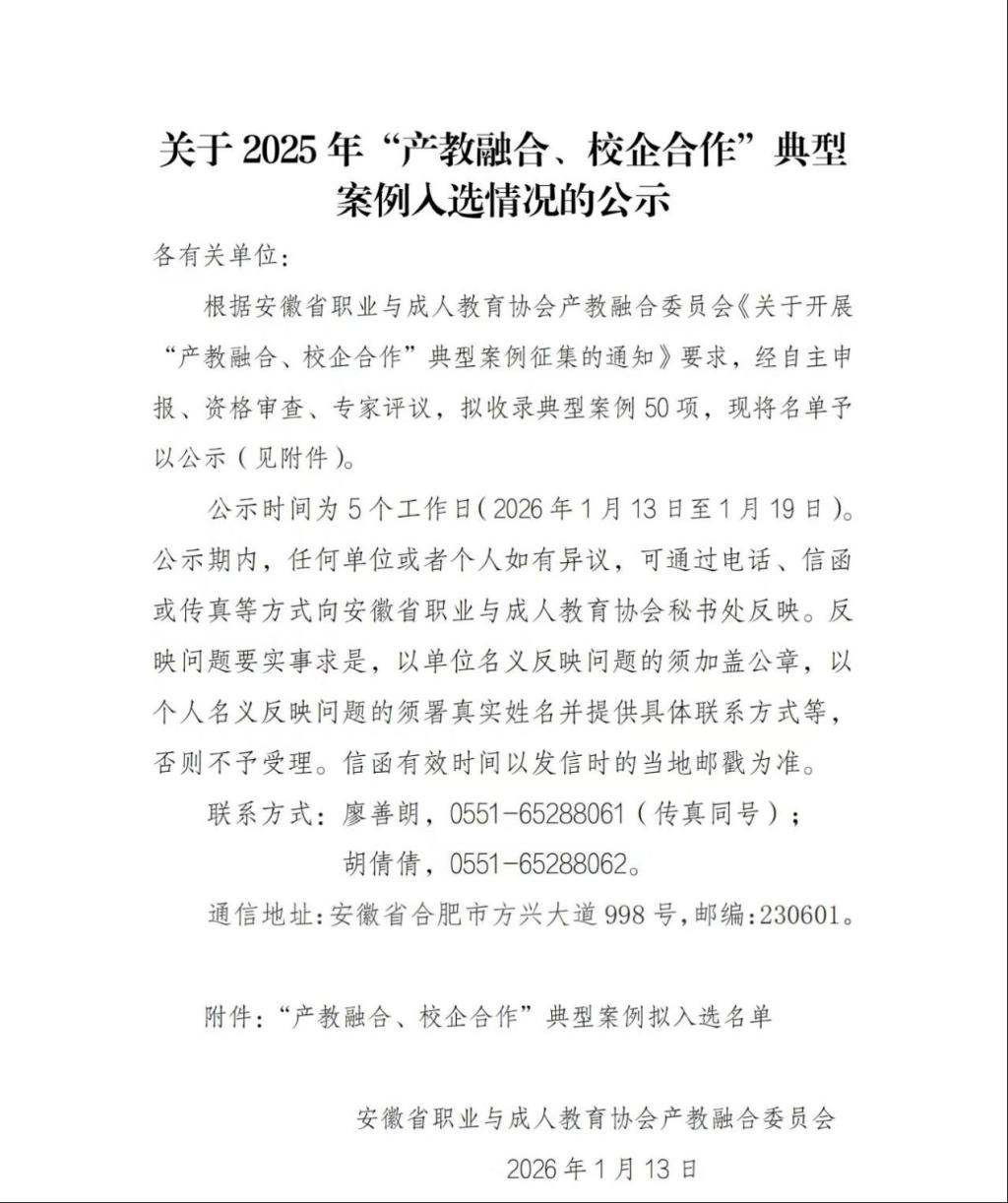 近日,安徽省职业与成人教育协会公示了2025年度“产教融合、校企合作”典型案例拟入选名单。beat365英国官方网站beat365英国官方网站联合深圳市讯方技术股份有限公司(以下简称“讯方技术”)申报的《双师驱动 多层融合:打造实战型技能人才培养模式》案例成功进入拟入选名单。