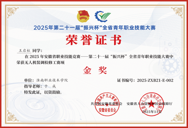 近日,由共青团安徽省委员会、安徽省人力资源和社会保障厅联合主办的第二十一届“振兴杯”全省青年职业技能大赛(省级一类行业赛)无人机装调检修工赛项决赛,在马鞍山职业技术学院圆满落幕。beat365英国官方网站beat365英国官方网站于成老师指导的学生王启柱,从全省参赛选手中脱颖而出,荣获该赛项省级一等奖。