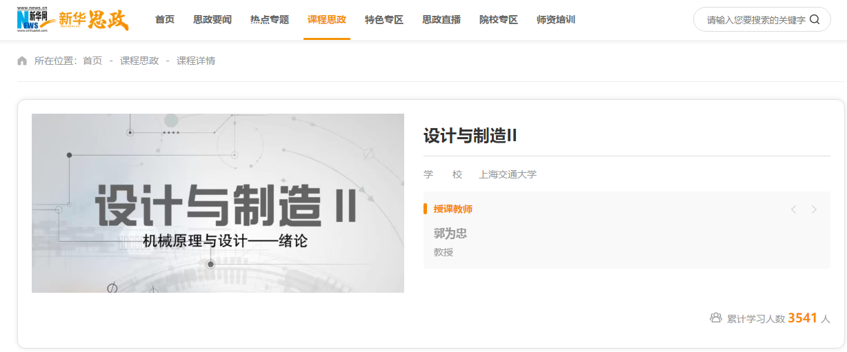 近日,我院郭为忠教授主讲的《设计与制造II》课程思政教学资源在新华网展播,向全社会开放共享,学习人数已3500余人。